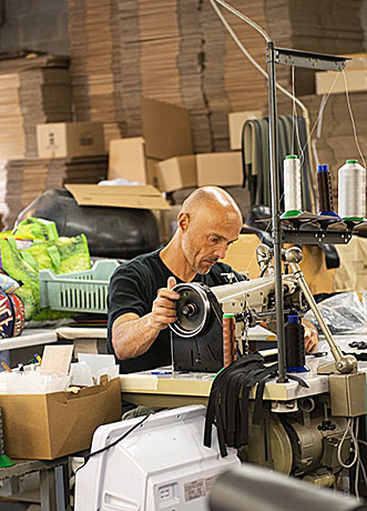• Tout d’abord les ballons usés ou défectueux sont récupérés puis découpés dans un ESAT, (Établissement et service d’aide par le travail) car nous souhaitons soutenir l’insertion professionnelle des personnes en situation de handicap.